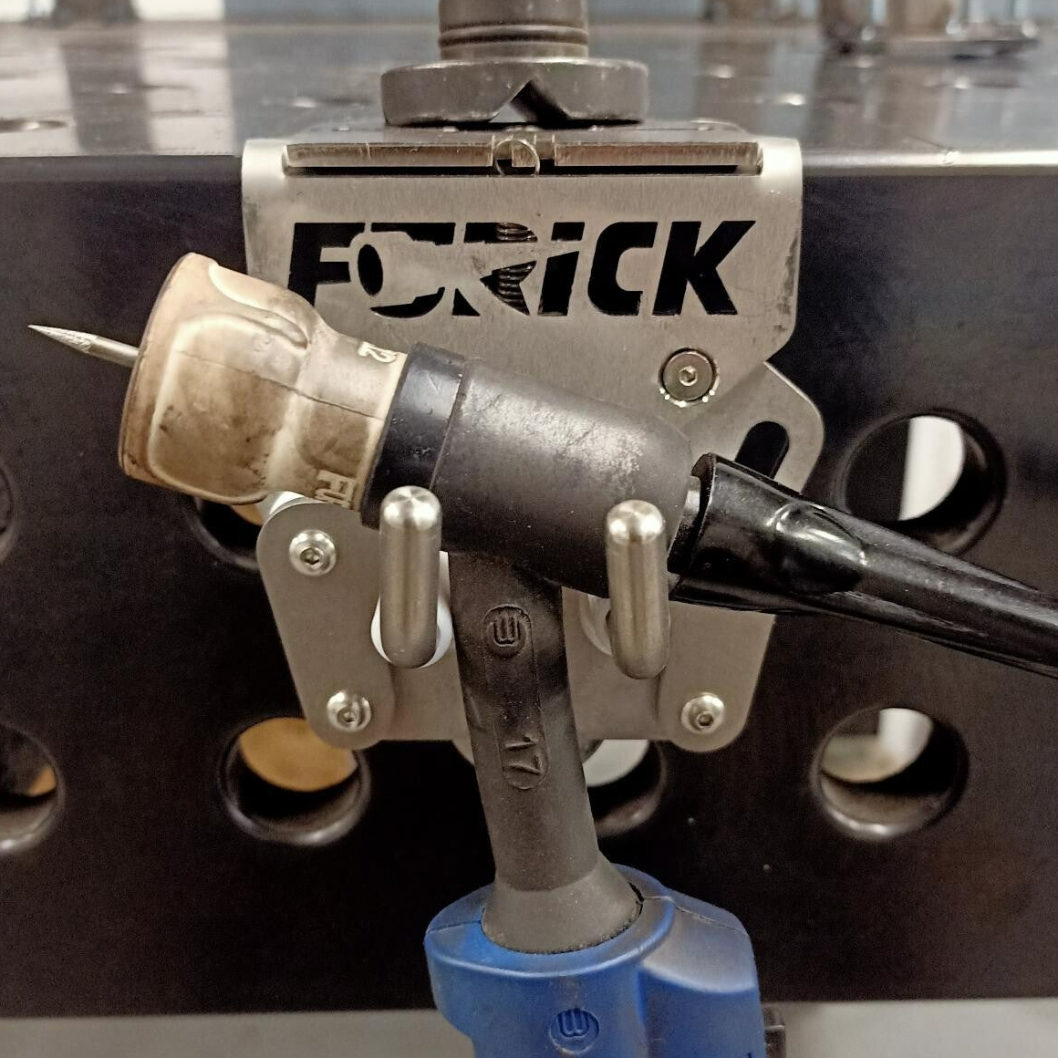 Indien je een kleinere toorts hebt, kun je de houder met behulp van stelschroeven en -sleuven zo afstellen dat de twee grijpers dichter bij elkaar staan.